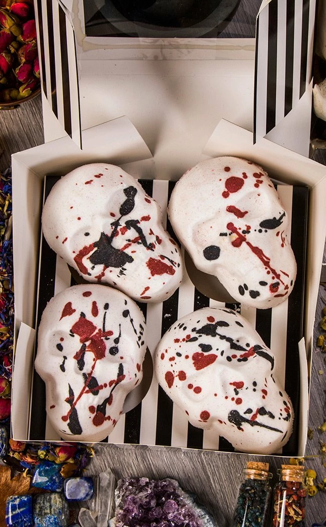 These bombs areΒ sick AF. Bone white skulls with red and black splatters and black embeds that make dark clouds in the water. They turn your bath into a raspberry vanilla scented, black whirlpool of fun! These are huge MF’s – they weigh 180 grams.