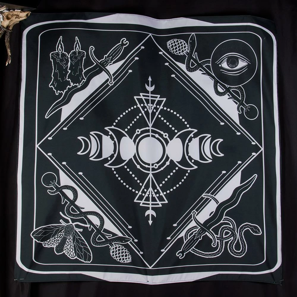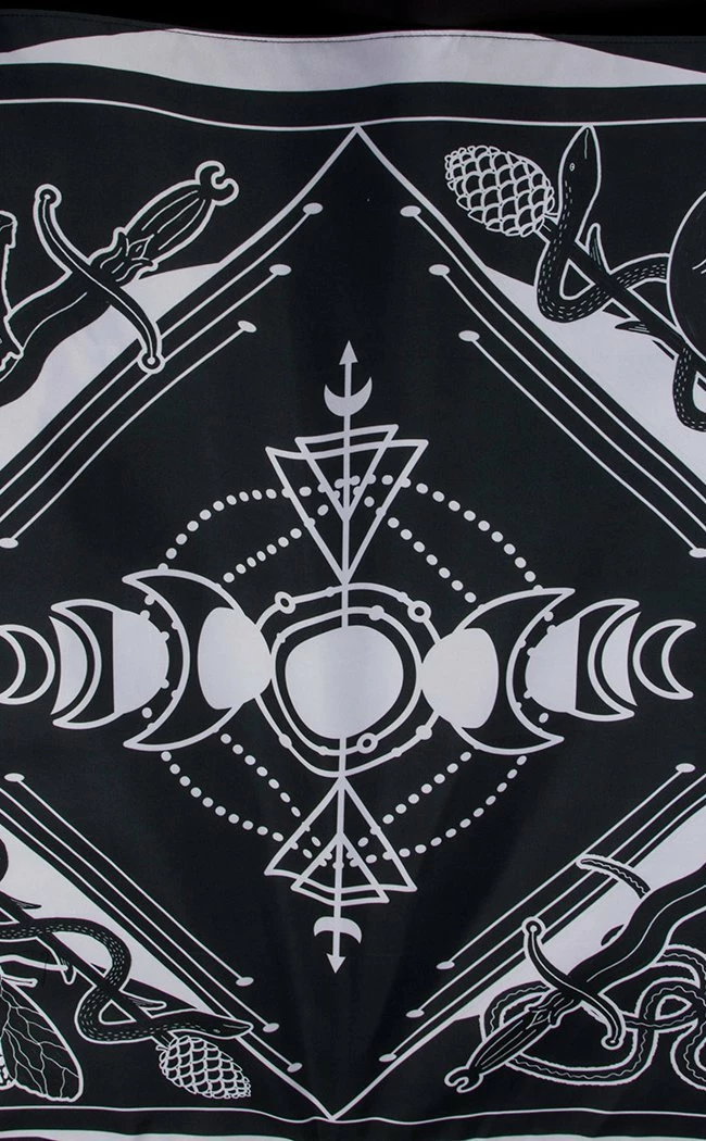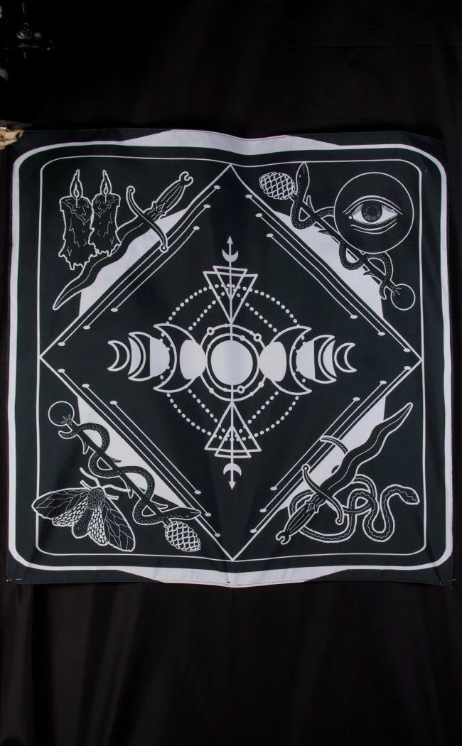 This design features powerful magickal symbols including an athame representing controlling of energy, nature symbols such as the moth, black candles representing banishment of negative energy and an eye and pine cones symbolising the inner eye/third eye opening.