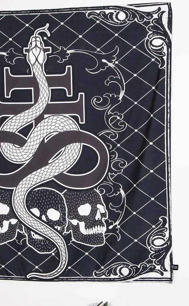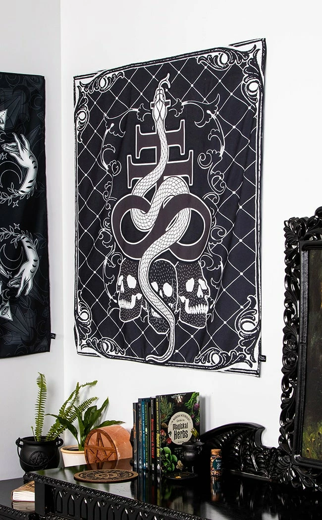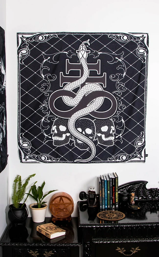 Worship your inner goddess with the Lilith Tapestry Throw! This gorgeousΒ tapestry features aΒ serpent coiling around the symbol of the Leviathan and sitting on a bed of skulls.Β Filigree borders and motifs add an extra fancy touch, because every chamber of hell should look its best!