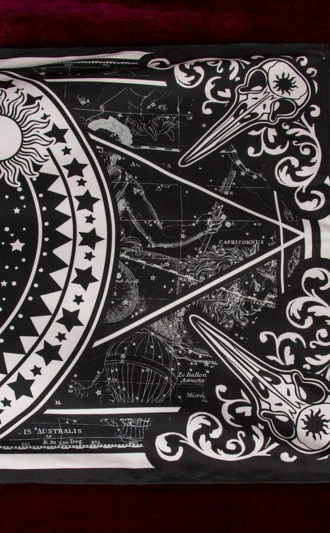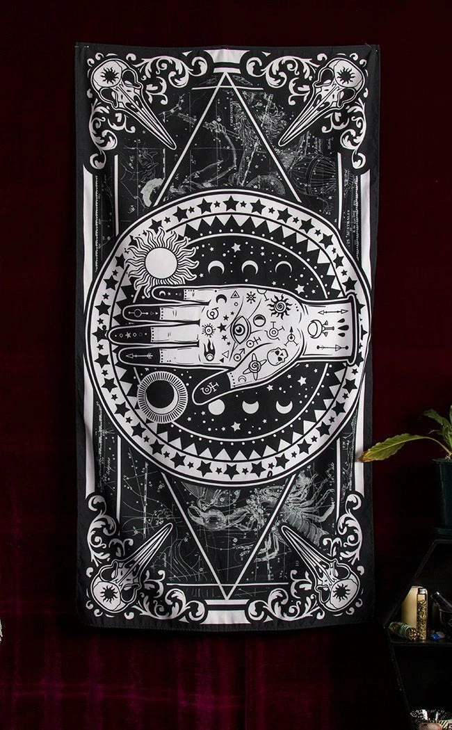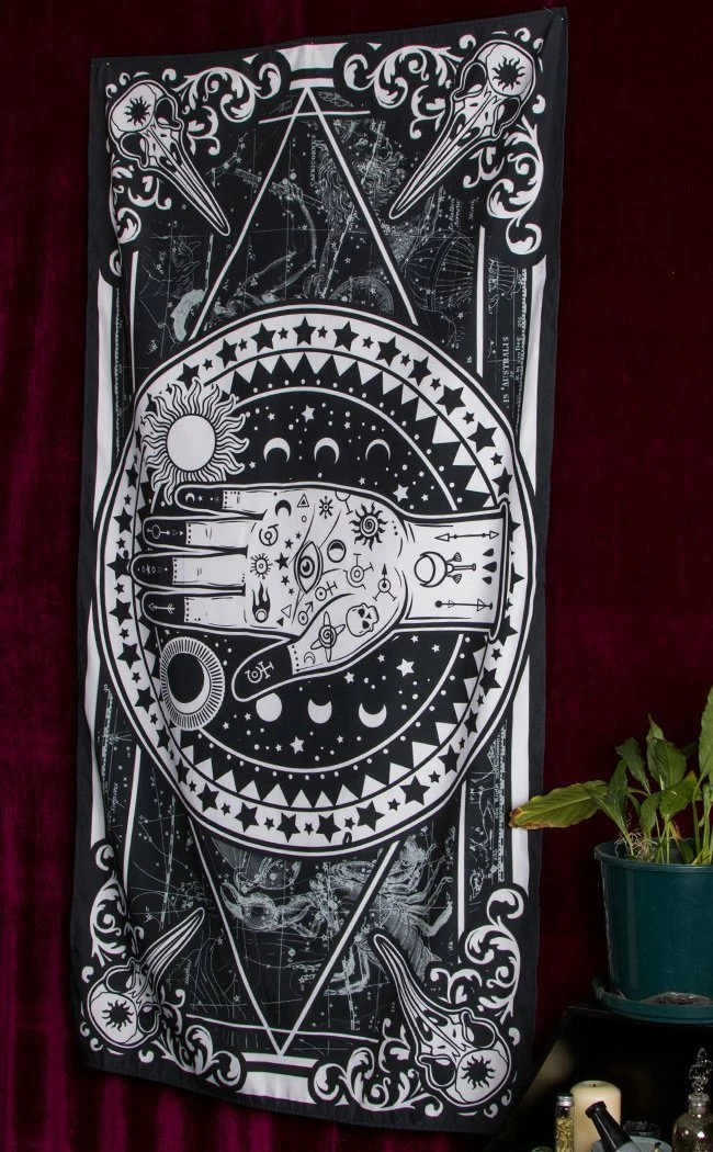 This design features a palm with blackened fingertips, decked out in sacred symbols and surrounded by the heavens.Β The sun and moon sit opposite one another, while the background starmap is watched over by 4 raven skulls sitting in the corners.