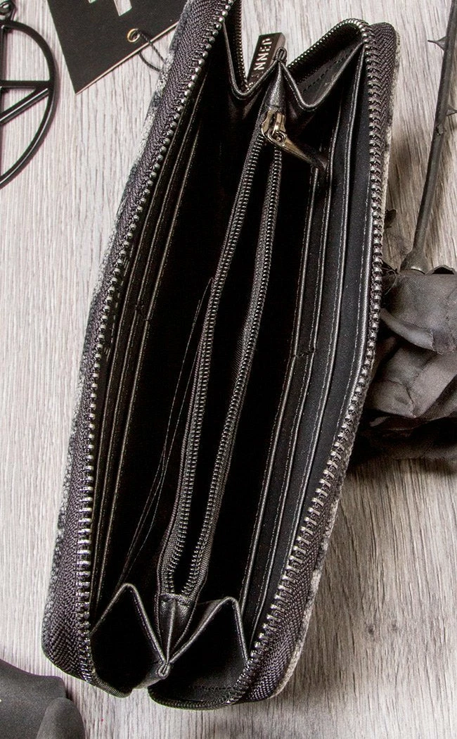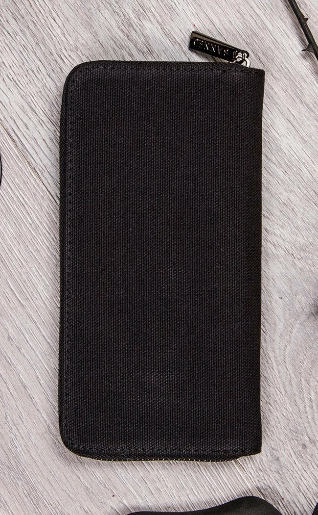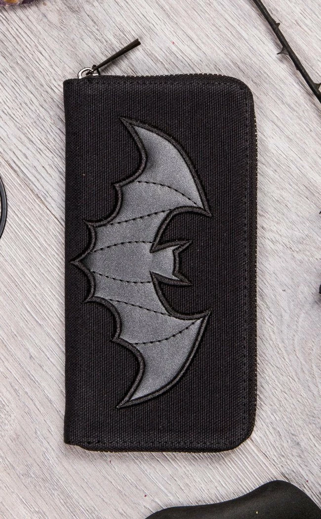 Show your love for the darker things in life with the Dragon Frenzy Wallet from Banned Apparel. This black canvas wallet features a large bat design. The wallet has inner sections for your cards, notes and receipts, and a zip for your loose change.Β