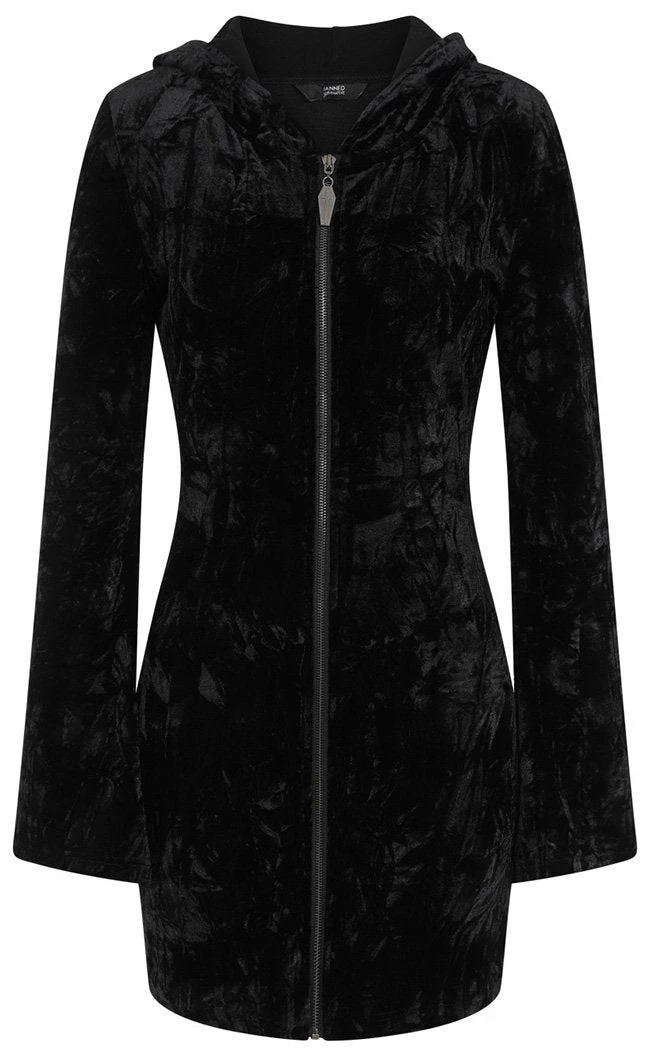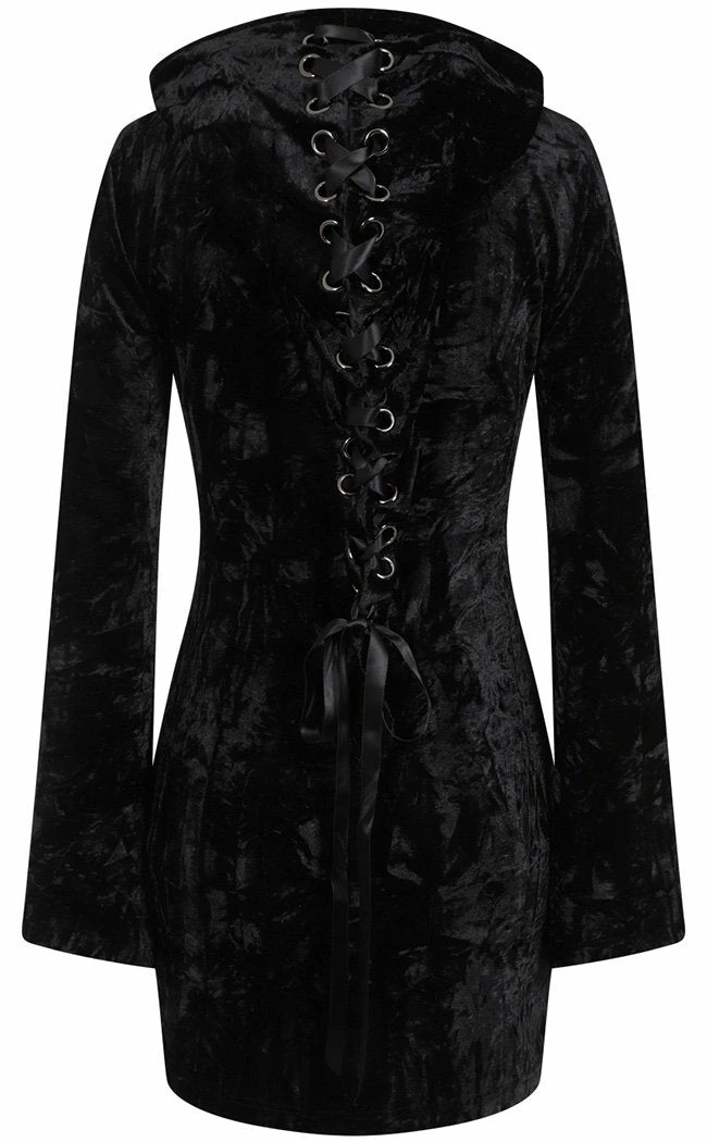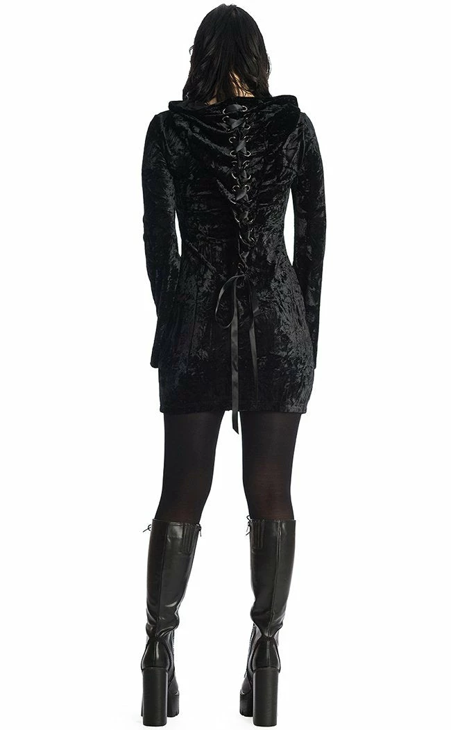 Battle the chill in this luxe velvet dress!Β The slinky velvet hugs your figure and is incredibly soft to the touch, securing with a full-length zip crowned with a coffin charm.Β The hood and back of the dress feature a large corset detail, adding some fantasy mystique to your lewk.