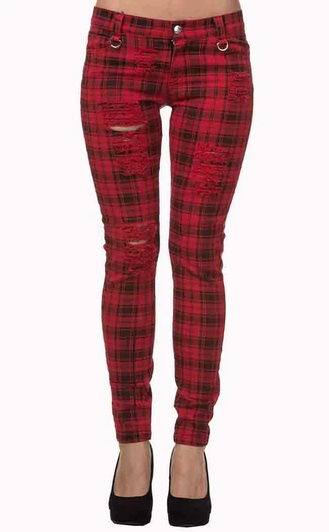 Badass red tartan jeans with front pockets, back zipped pockets and O-ring details. Nicely ripped. Pair with some bad ass black boots and chain belt. Stretchy, comfy material.Β