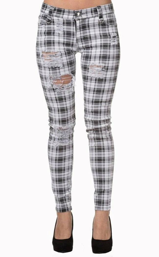 Badass white tartan jeans with front pockets, back zipped pockets and O-ring details. Nicely ripped. Pair with some bad ass black boots and chain belt. Stretchy, comfy material.Β
