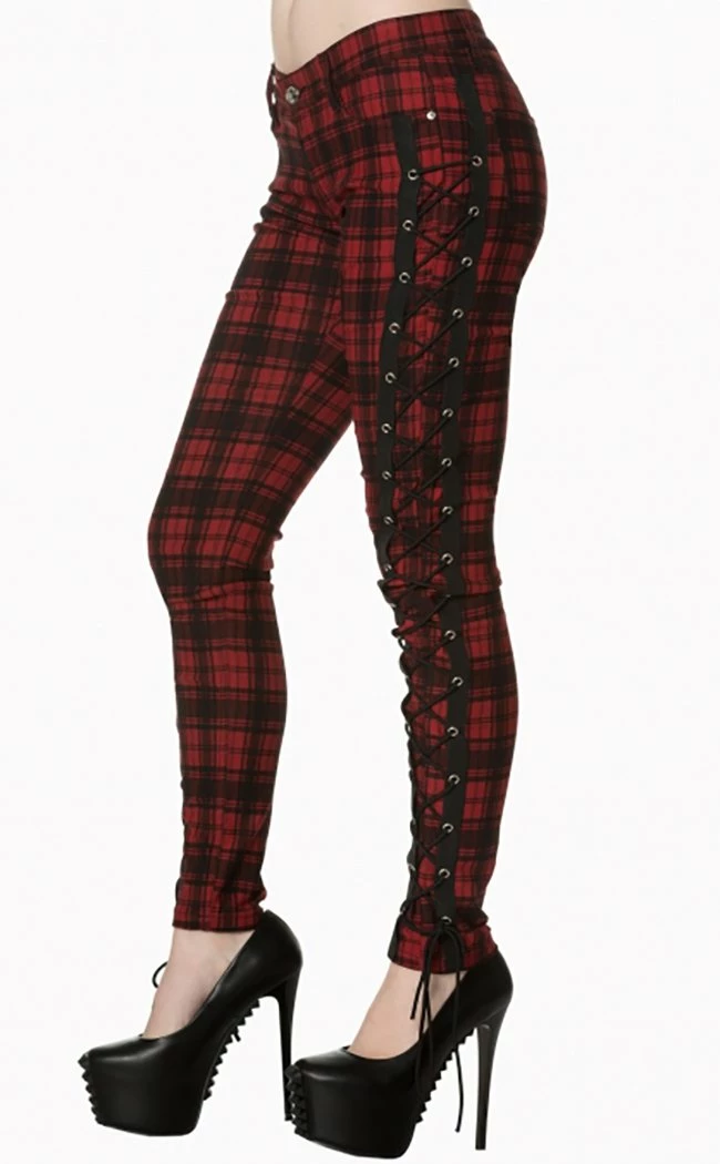 Badass red tartan jeans with front pockets, back zipped pockets andΒ corset lacing up the sides.