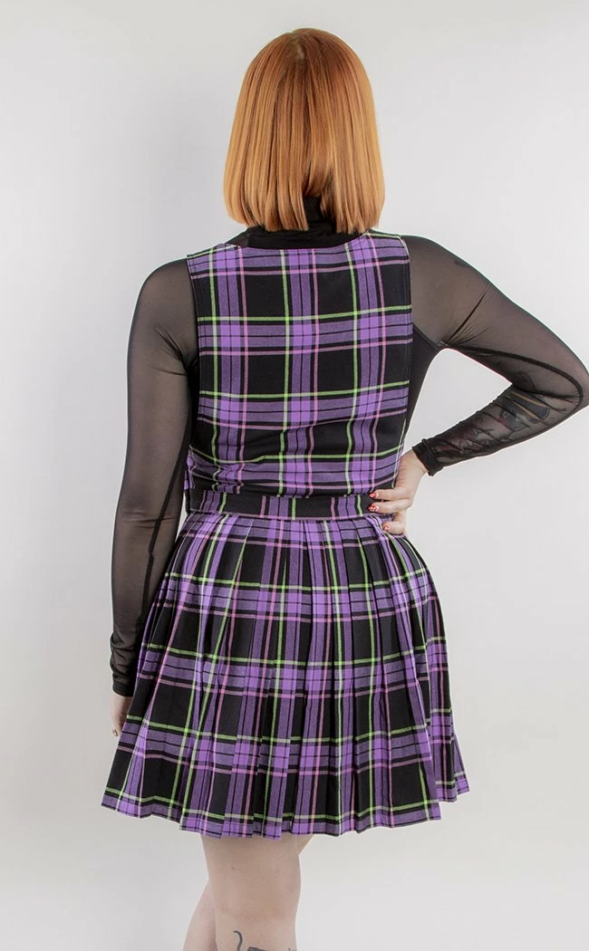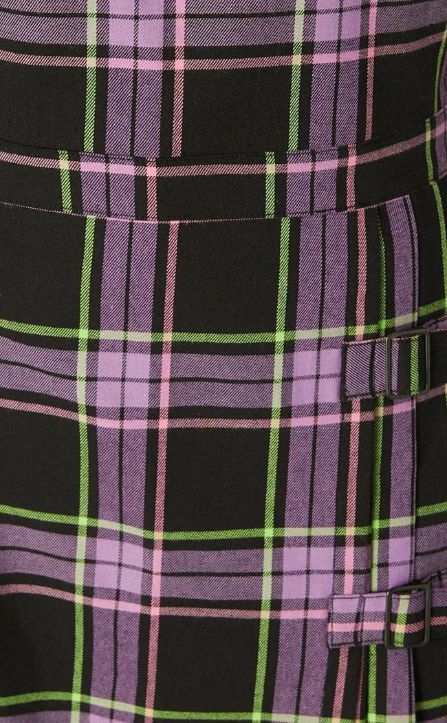 This tartan is a uniquely pastel purple and neon green pattern that takes centre stage. The bib buckles up with black metal trimmings at the shoulder, the pinafore closing with a side zip for easy on off. The skirt is pleated and has belt loops at the waist so you can accessorise to your mood.