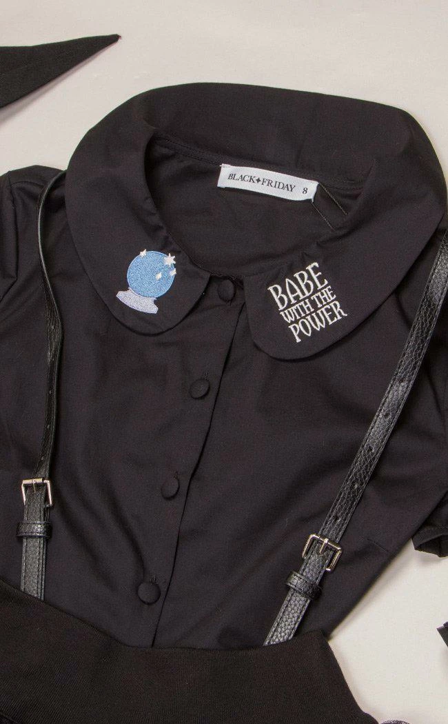 Dress up to the nines and watch as the world falls down.Β Β This sweet blouse has a Peter Pan collar with an embroidered crystal ball and the phrase “Babe With The Power”.Β