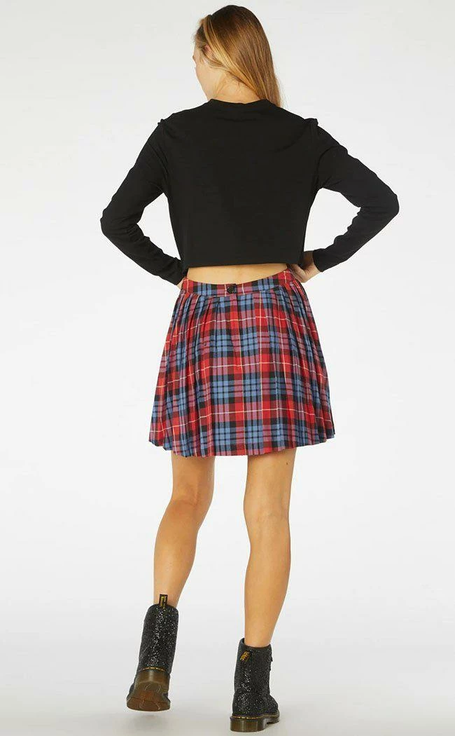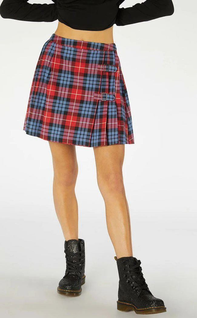Put a little voodoo on those legs!Β Burgundy and blue cross together inΒ a gorgeous tartan pattern on this skirt, coming with belt hoops so you can accessorise to the max!