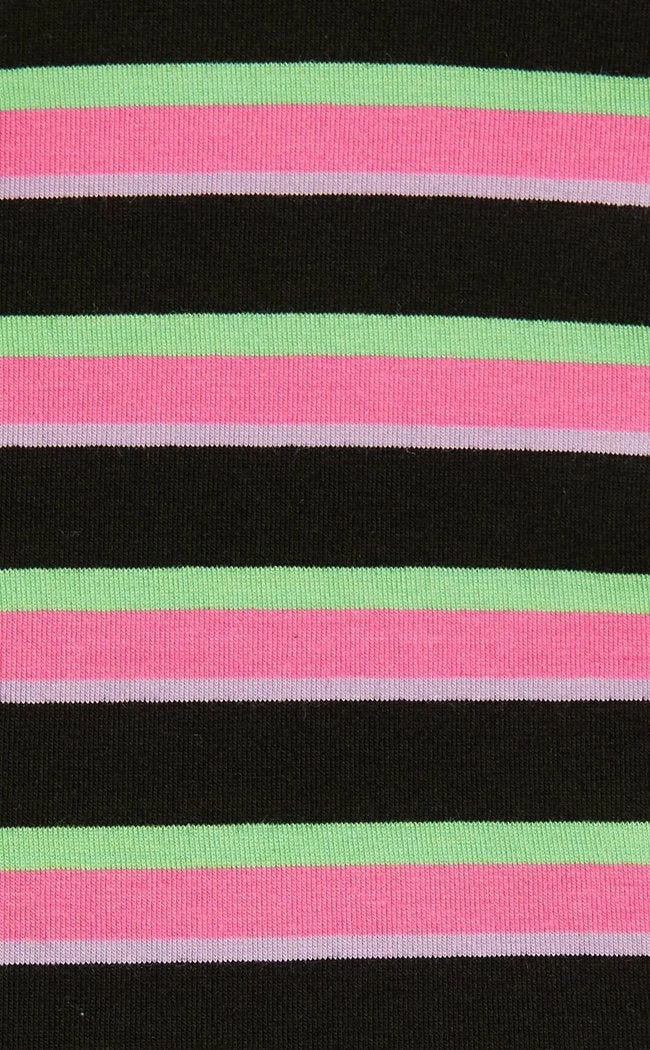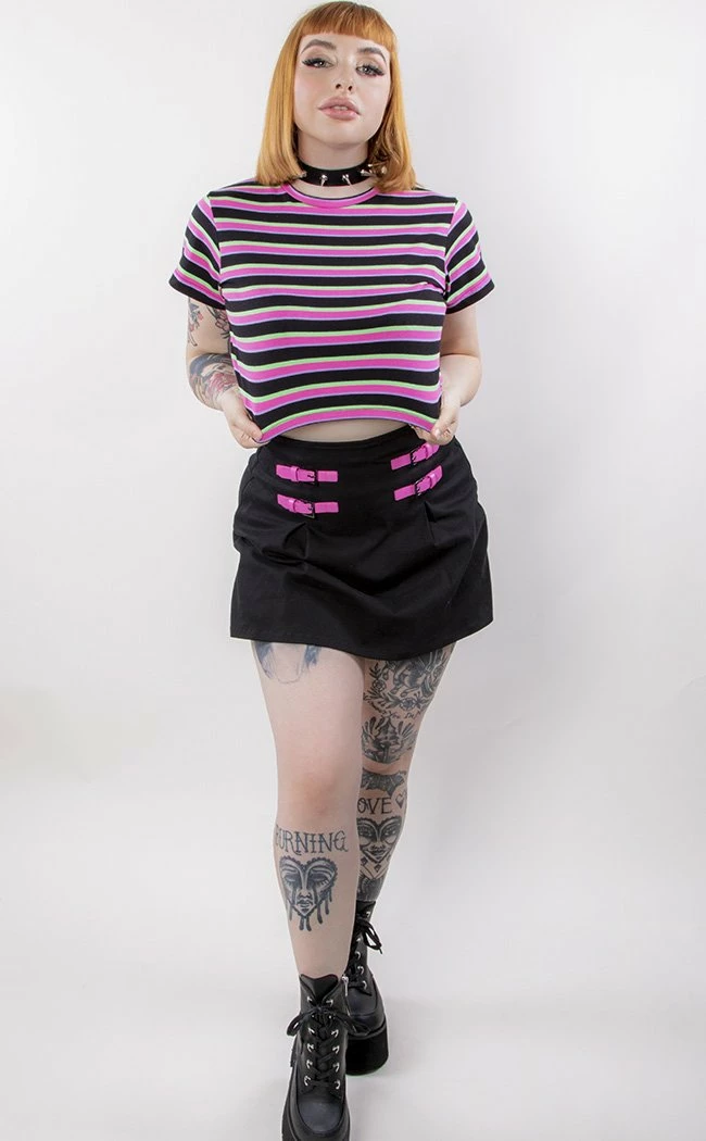 Brighten up yer wardrobe these retro stripes!Β This tee is cut into a mid crop length, featuring aΒ round neckline and short sleeves.Β It’s a versatile piece ideal for wearing with black shorts n pants, or taking to the next level by adding matching neon accessories!