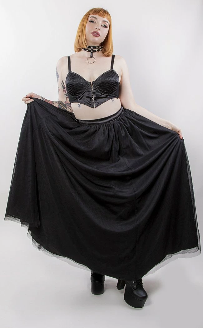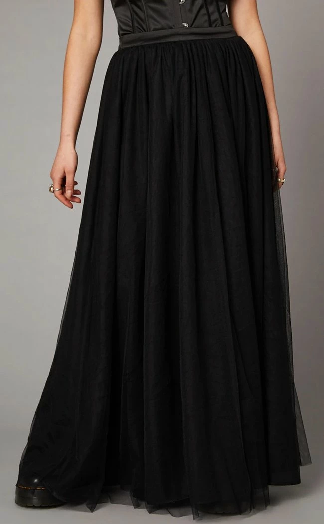This dramatic maxi skirt is floor length with multiple layers of soft tulle flowing around your ankles.Β The satin lining ensuresΒ that you’ll twirl in comfort and zips closed for easy on/off.