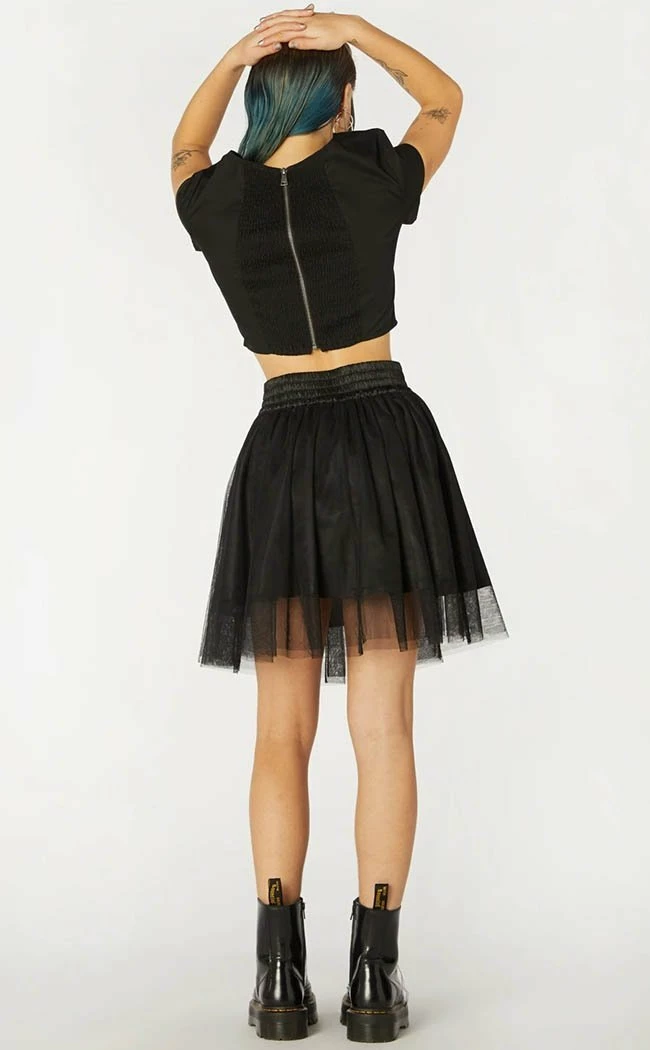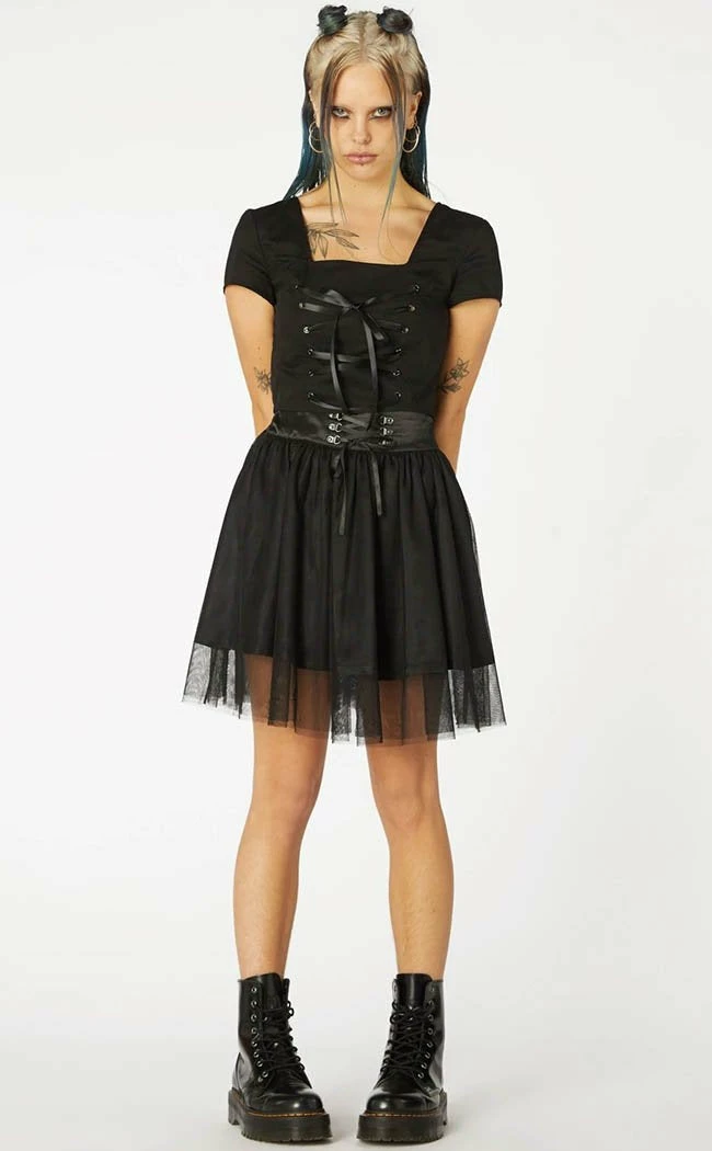 Be a dark doll with a casual fit!Β This cropped blouse has a square neckline and capped sleeves echoing vintage fashion.Β The front laces all the way up with ribbon corseting and has a back zip closure for easy on off.