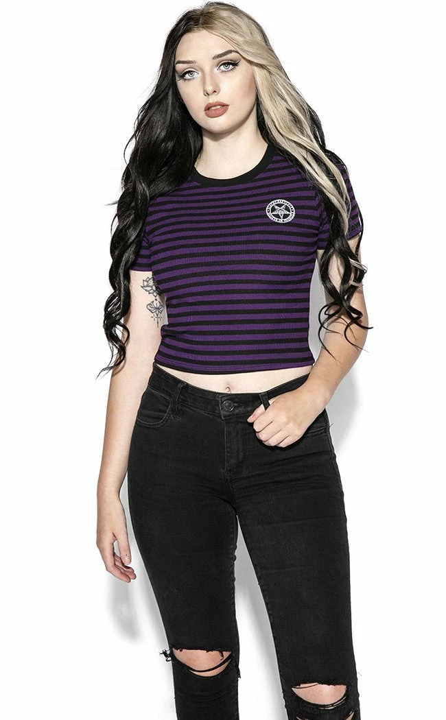 Deck yourself out in midnight stripes for goth girl summer-topped off with a bold black collar and the Blackcraft BIY logo on the breast.Β