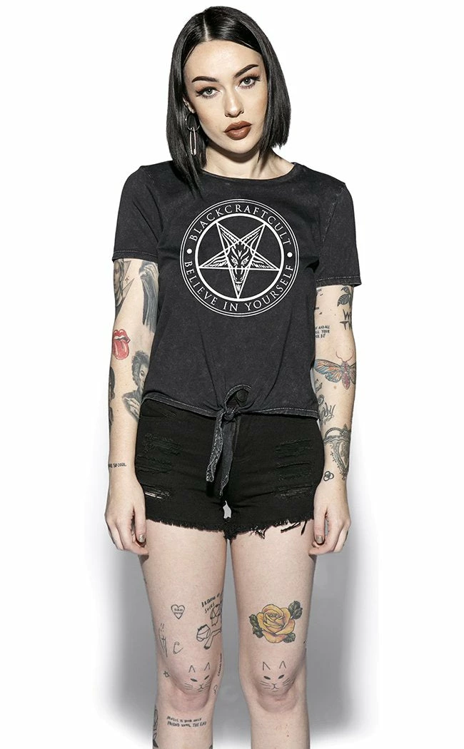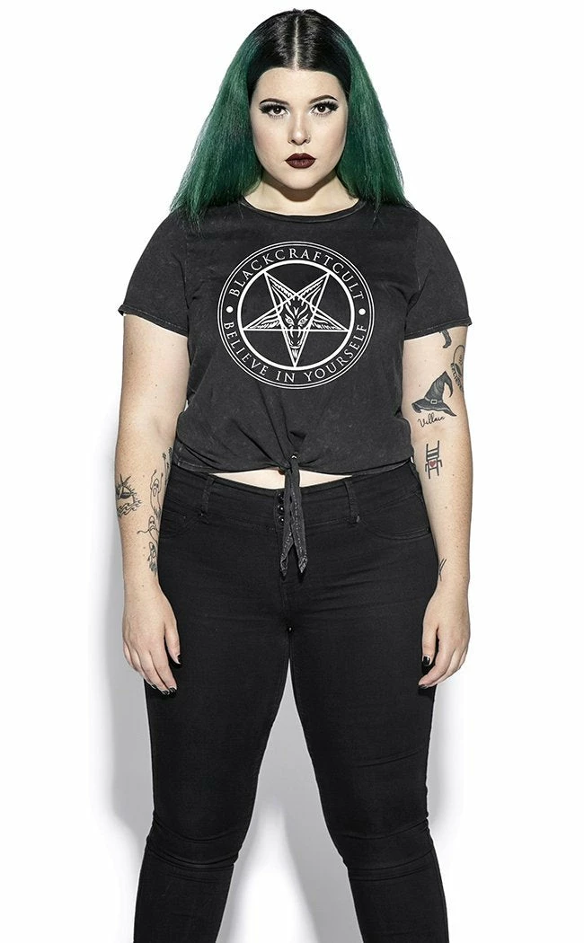 Not everyone wants a crop too short-this tie front crop will let you make it as short as you please!Β Blackcraft’s iconic goat pentagram is emblazoned on the chest of super breathable cotton, perfect for adding some metal style to your summer wardrobe,