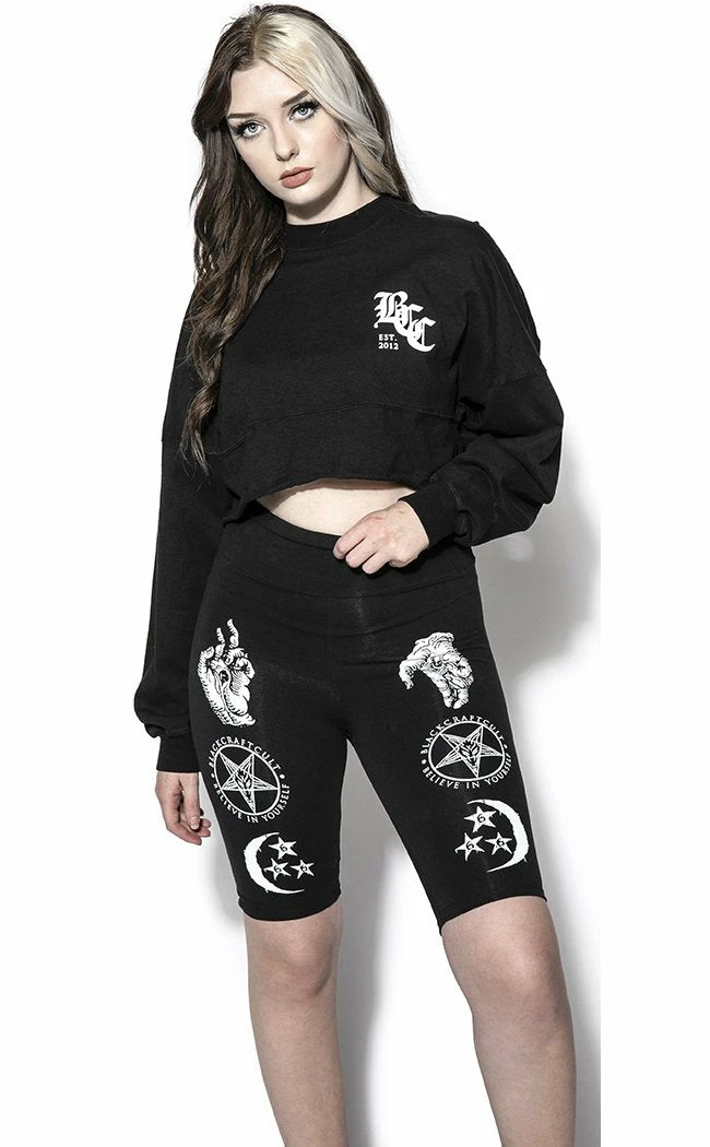 These shorts feature a print of severed hands, pentagrams and crescent moons up the thighs.