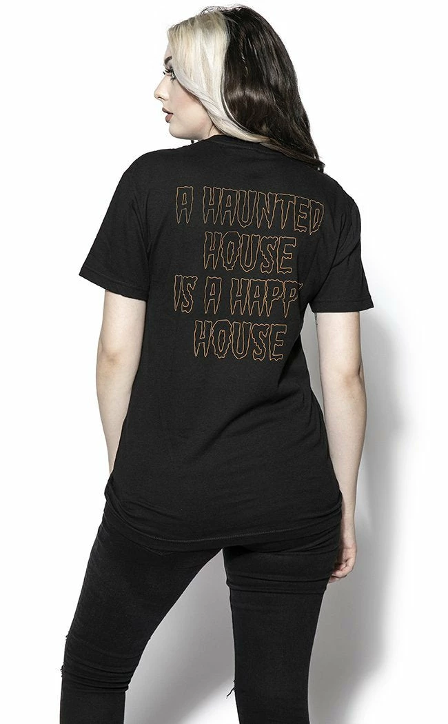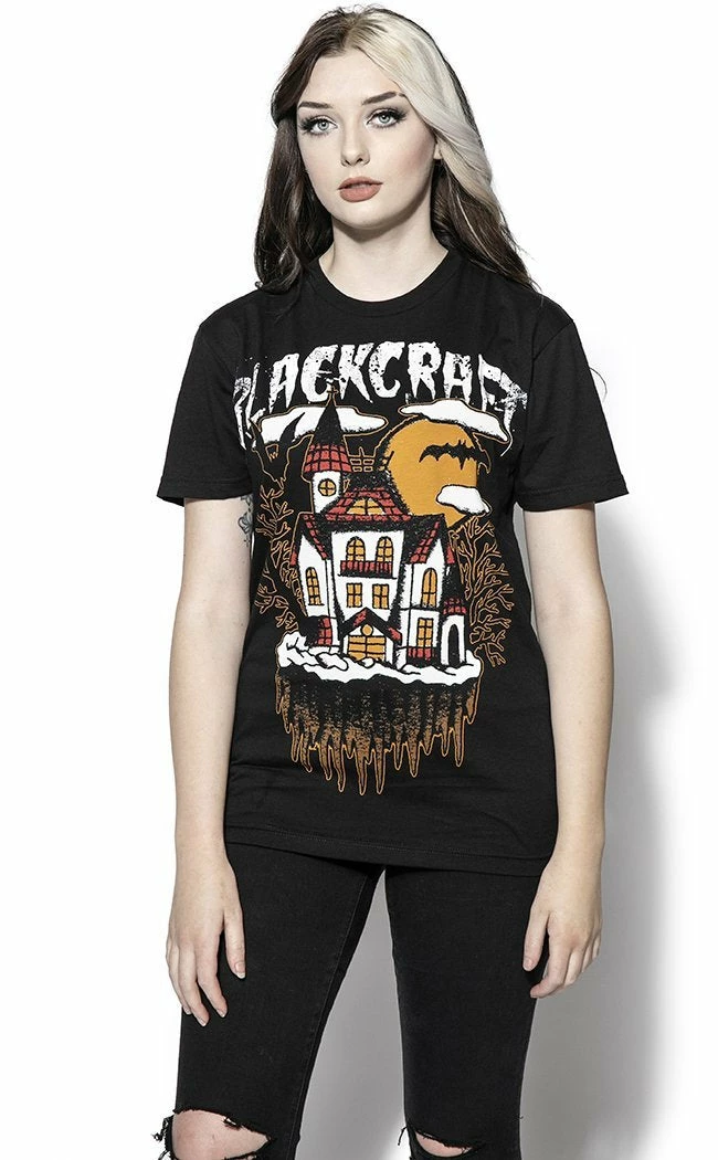 Yet another spooktacular tee from Blackcraft!Β Β Halloween oranges, reds and chilling whites make up this cartoonyΒ house of horrors under the Blackcraft logo in chilling font.Β The back is printed with the words “A Haunted House is a Happy House”, because ain’t that the truth!