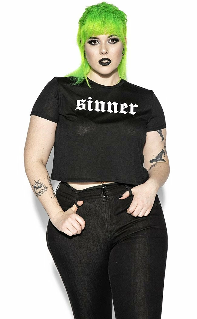 Wear your heart on your sleeve and your occupation on your chest.Β Any good heretical babe needs a work tee-“sinner” in printed on the front of this crop in bold white, the Gothic lettering making it all a lil extra.