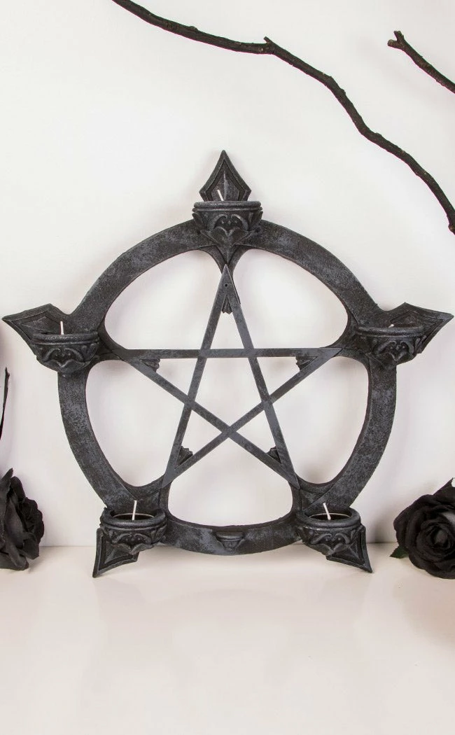 A magickal sconce to light the way for guests and good energies.Β An upright pentagram is cast in dark painted resin to look as if lifted from an ancient place of power, a holder for tealights placed at each point.