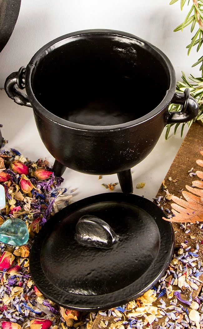 Large sturdy cast iron black cauldron. It is well made and has little side handle detail, carry handle, lid and 3 legs. Great for burning charcoal and herbs or incense…or brewing up trouble!
