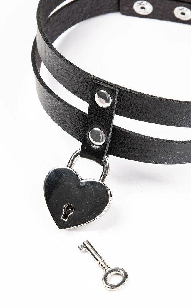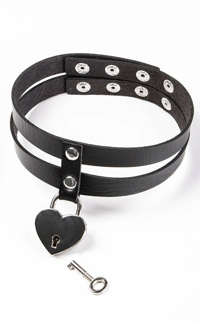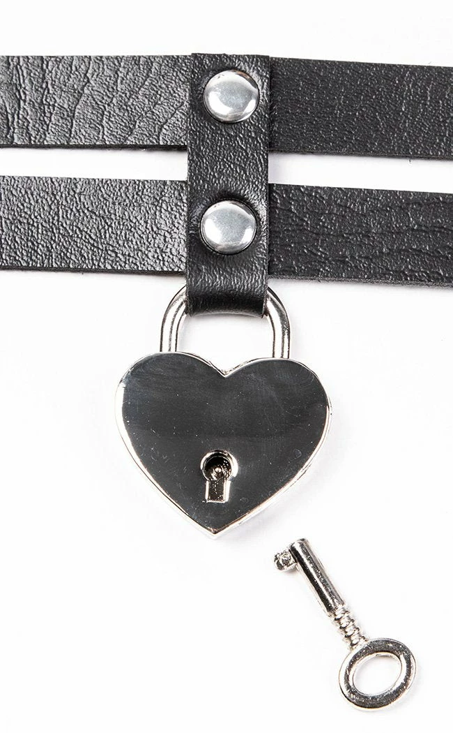 Cage your heart in layers of luxury vegan leather! Two straps are connected with a studded panel for a sultry garter effect, from which a heart-shaped padlock hangs.