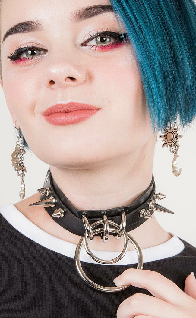 Wreak a little havoc.Β Two silver-look O rings are held against a thick black band by 3 hoops,Β flanked by spikes.Β Fastened at the rear with a buckle.