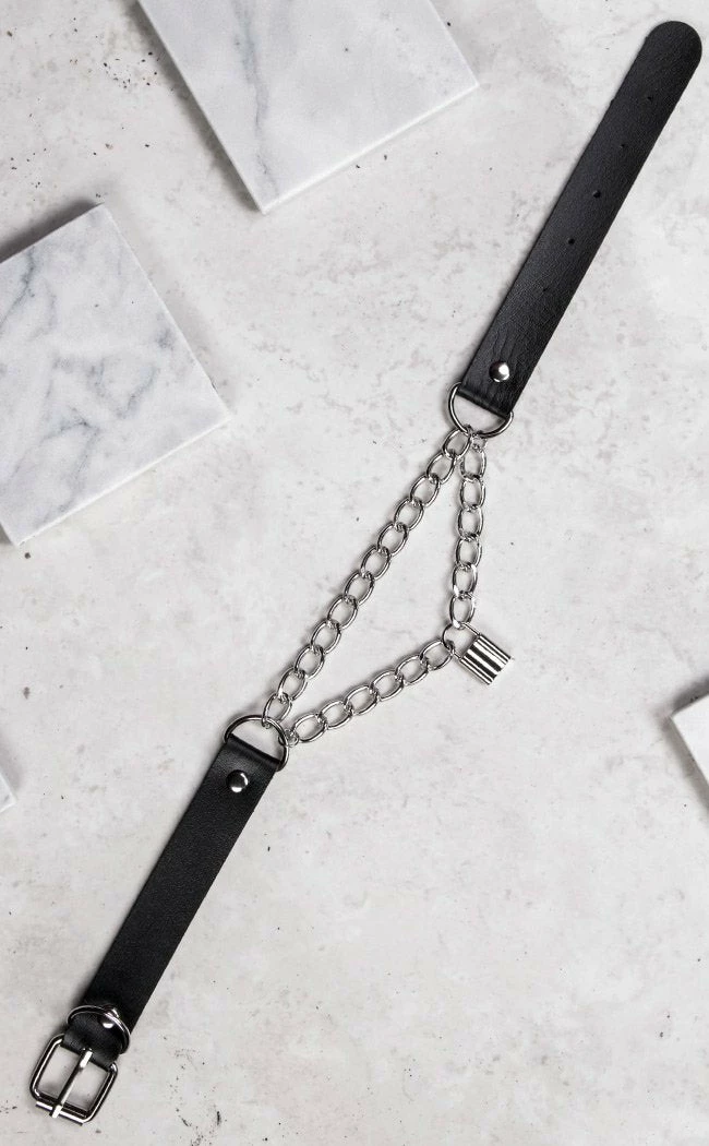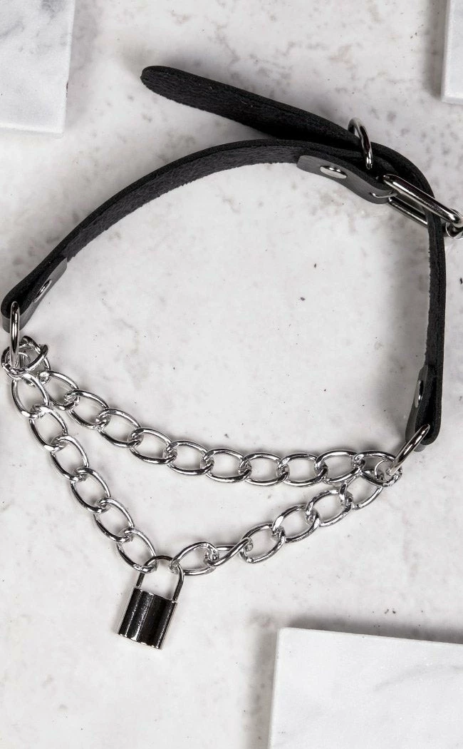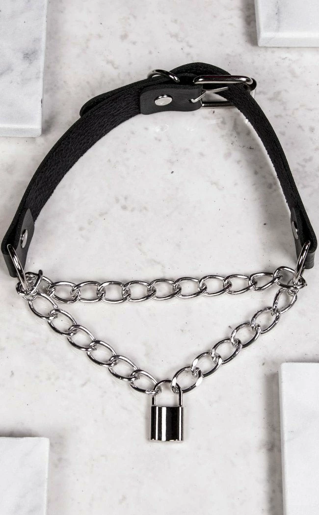 Don’t chain yourself up too tight…. This unique choker features two chains at different heights with a sweet little lock adorning the lower chain. Adjustable with buckle fastener.Â