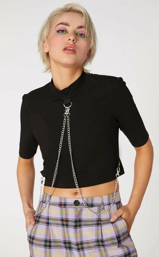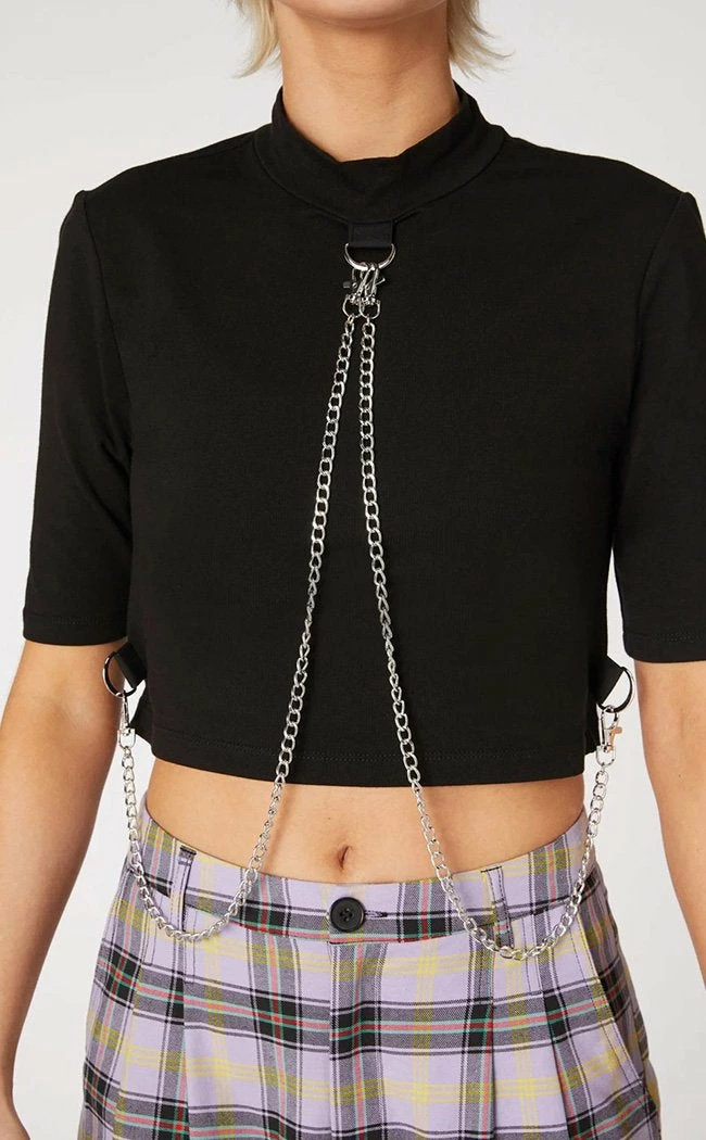 This sexy af crop has a high neckline and sleeves that sit just above the elbow for a flattering fit.Β Two detachable chains hang from a D ring at the neck and connect at the sides, creating a statement lewk that gives yer bod the attention it deserves.