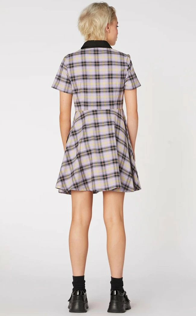 Look grunge, rebellious and cute all at once with this lavender frock!Β The body is a killer tartan in a flattering fit and flare style.Β The dress is crowned with a contrasting black collar and secures with a full length button-up front.Β Plus, the skirt has pockets in the seam.Β Fully functional pockets!!!!