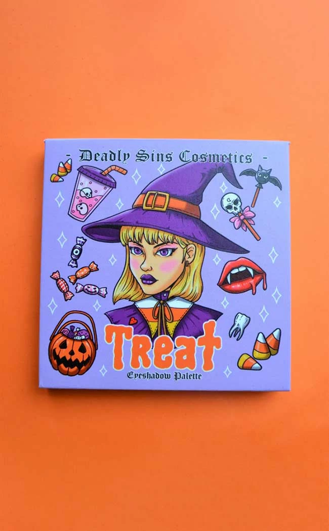 Satisfy your sweet tooth with the Treat Eyeshadow Palette! Each bright shade is inspired by and named after different kinds of Halloween candy. Each palette comes with 2 glitters, 2 shimmers and 5 mattes as well as a mirror inset.Â