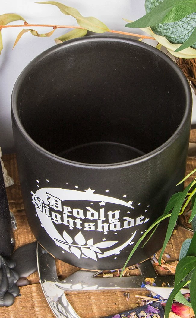 Keep your noxious weeds and deadly blooms cosy with this gorgeous pot!Β The ceramic is finished in sleek matte black, decorated with a contrasting art print of a crescent moon, stars, leaves and the words “Deadly Nightshade”.