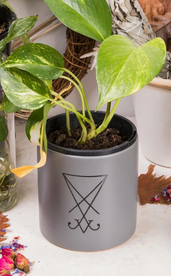 Beautiful grey matte planters made of ceramic material, decorated with a glossy black sigil of lucifer. Comes in three different colour options.Β