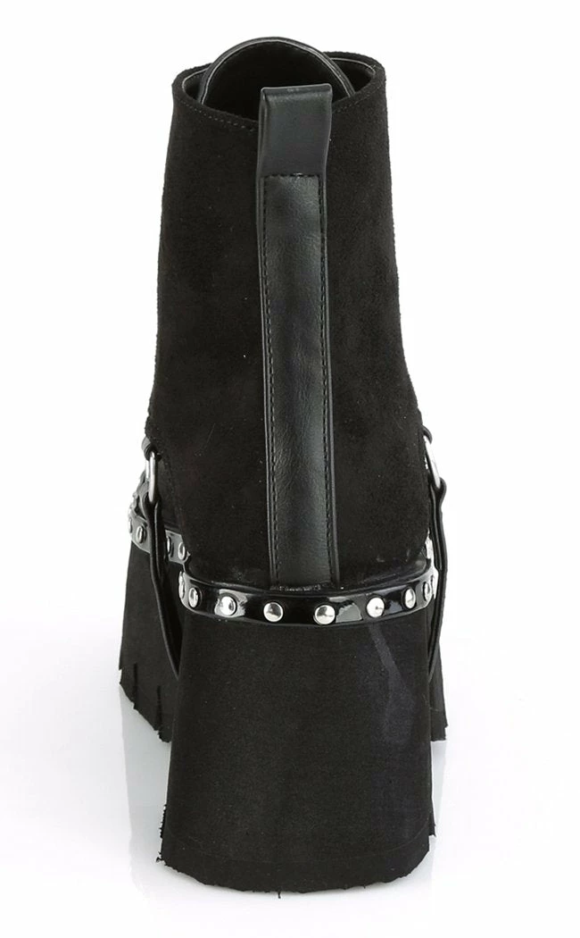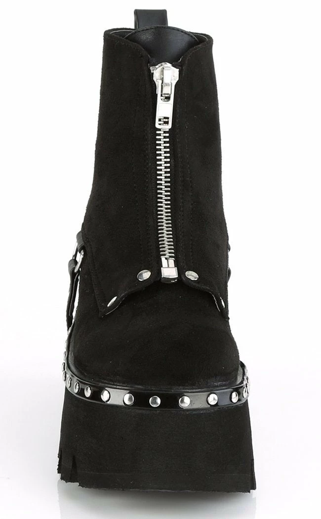 Lush black vegan suede ankle boots with metal front zip closure, shiny silver studs and D-ring harness strap.