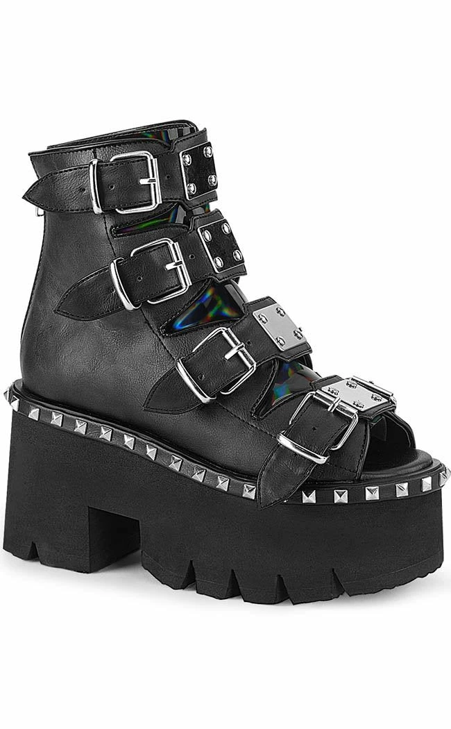 Black matte vegan leather ankle boots with open toe, metal front buckles, shiny silver studs and cool clunky soles. Comfortable enough to stand all day in.Β