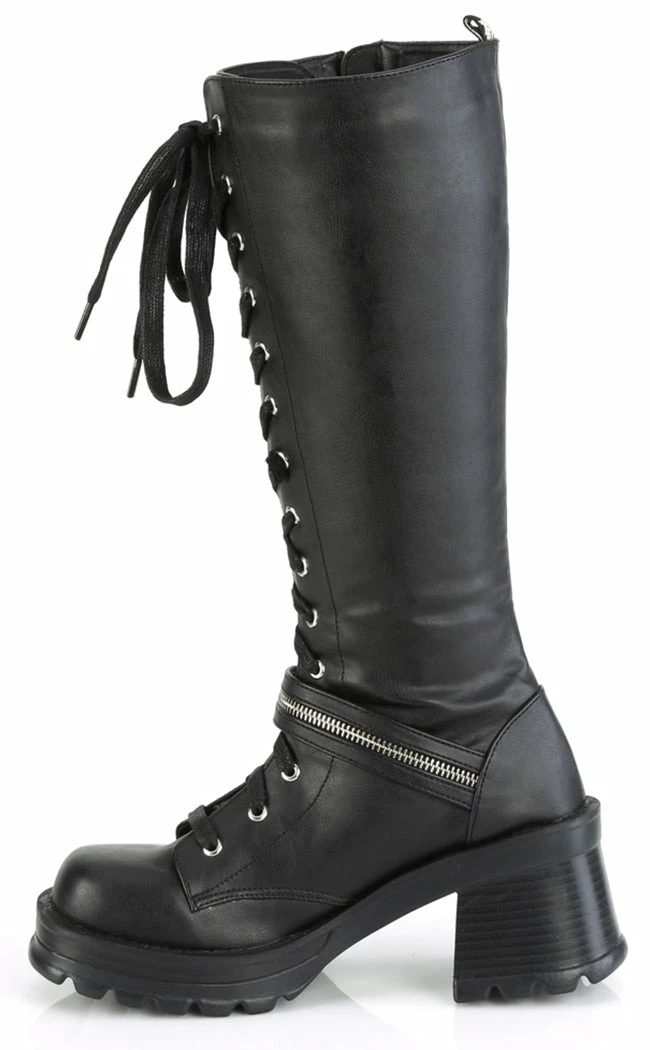 Get yerself in a bratty mood!Β The BRATTY-206 boots areΒ a badass pair of knee-high combat boots, featuring lace-ups, a buckle strap with a zip and handy full-length side zip.