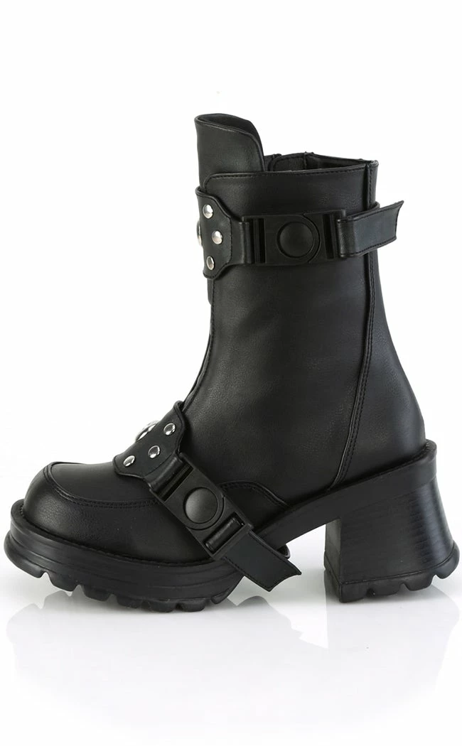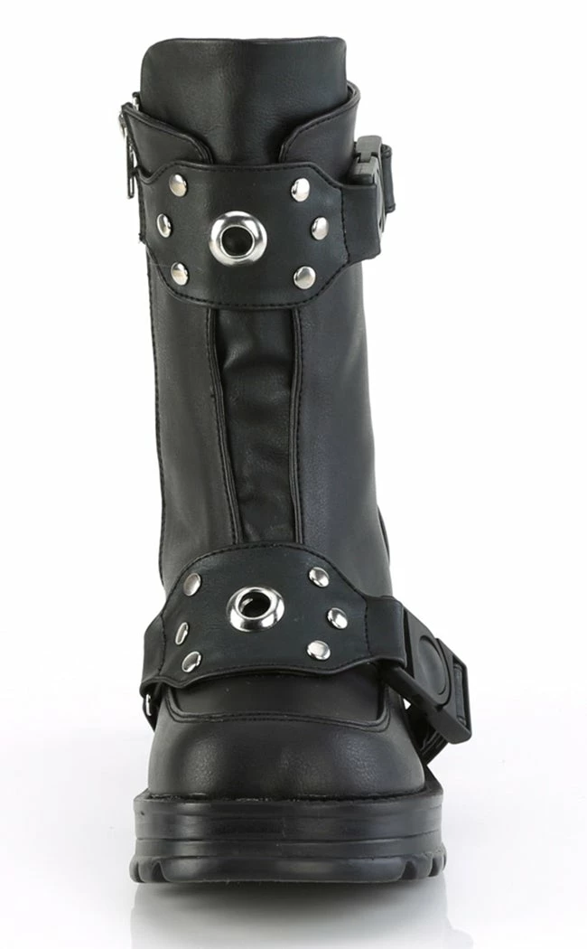Get yerself in a bratty mood!Β The BRATTY-56 ankle bootsΒ feature panels decked out in studs and eyelets, held in place with futuristic quick release buckles.