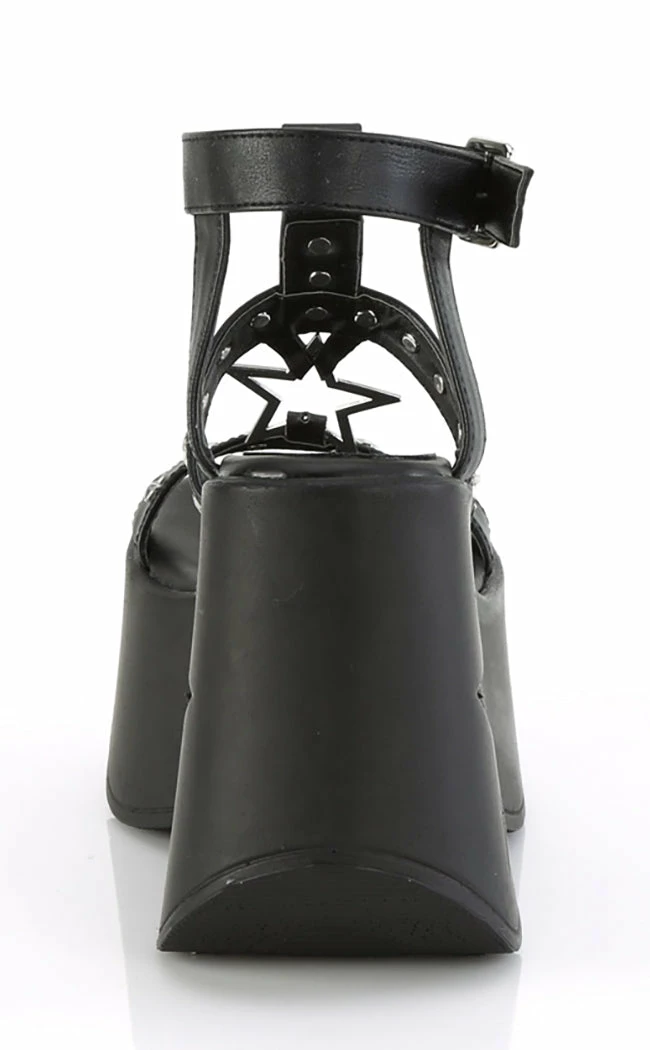 Be the star this summer in the DYNAMITE-12 sandals! These wedges are a strappy style sandal with a metal star cutout charm and matching star-shaped studs on the straps. The shoes secure with an adjustable ankle strap. Dress up n down for going out or casual summergoth looks!