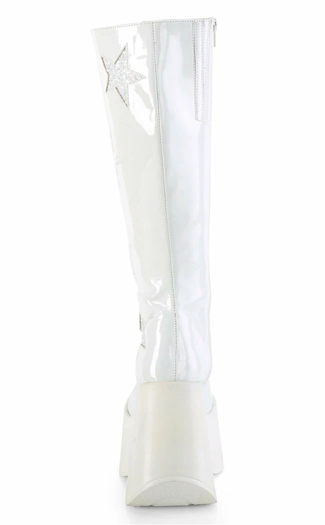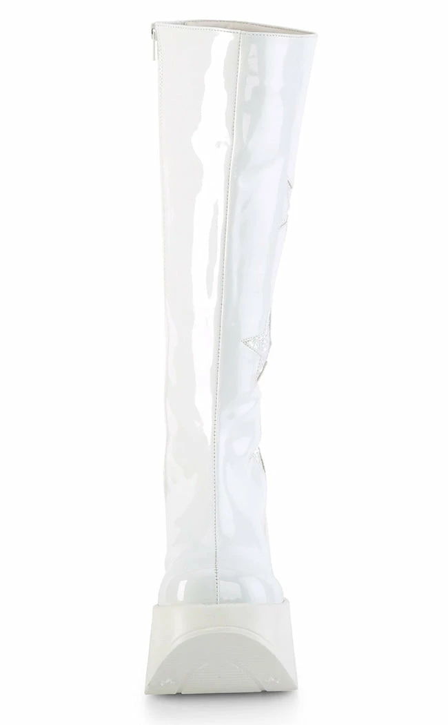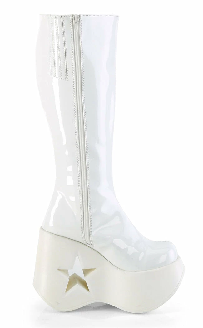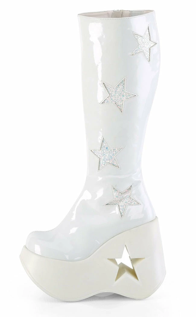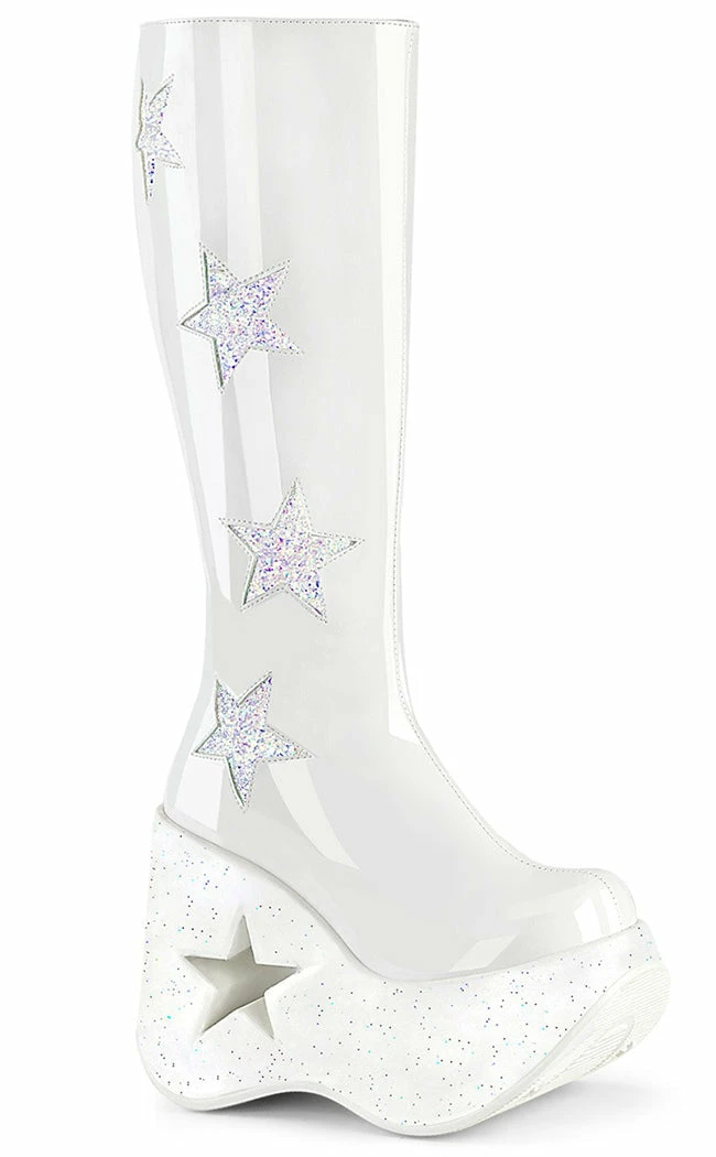 Baby, you’re a star!Β Β The DYNAMITE-218 boots are knee-length bootsΒ with glittering starΒ details to match the cutout in the wedge. The calf stretches and secures with a full-length inner zip.
