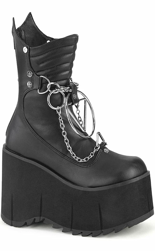 Get your futuristic stomp on with the KERA-130 boots!Β These impressive wedges feature a comfortable platform, wicked chains and an O ring feature as well as a pointed calf.