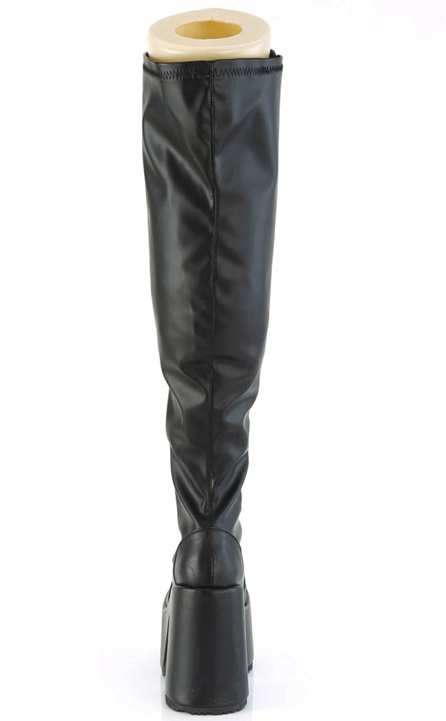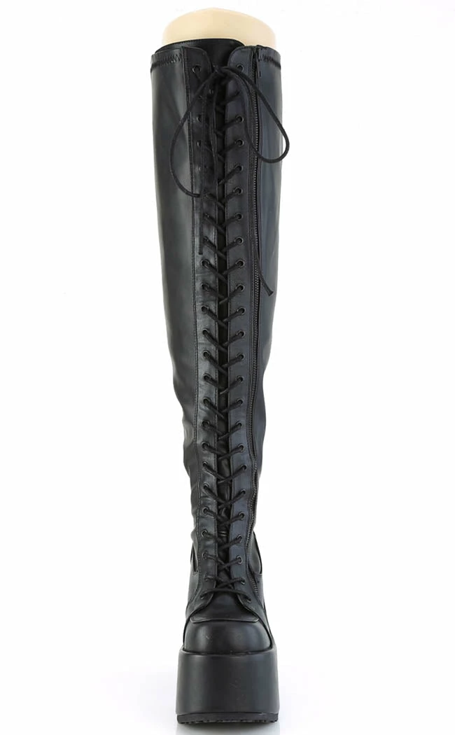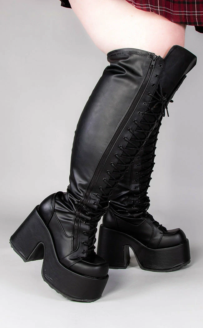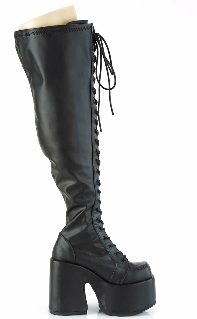 The same fave CAMEL-300 style, lace-ups and thigh-high sexiness, now wide calf friendly! Stretch faux leather and a side zip make these boots adjustable and easy to slip on and off.