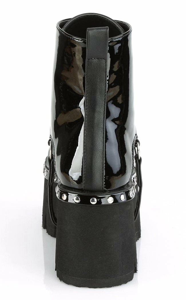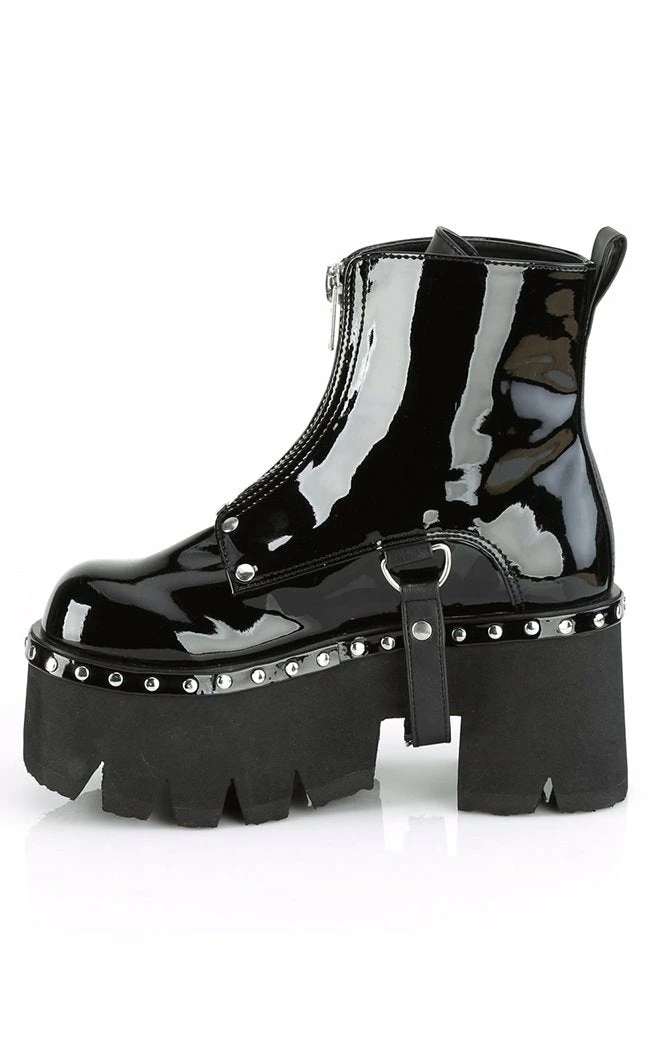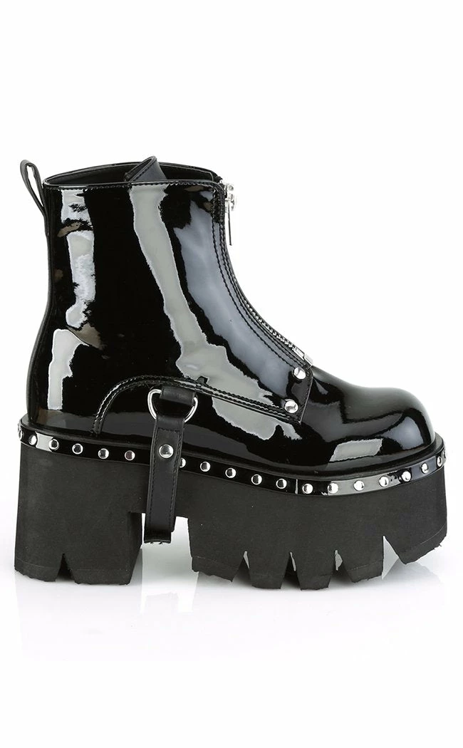 Slick black patent vegan leather ankle boots with metal front zip closure, shiny silver studs and D-ring harness strap.