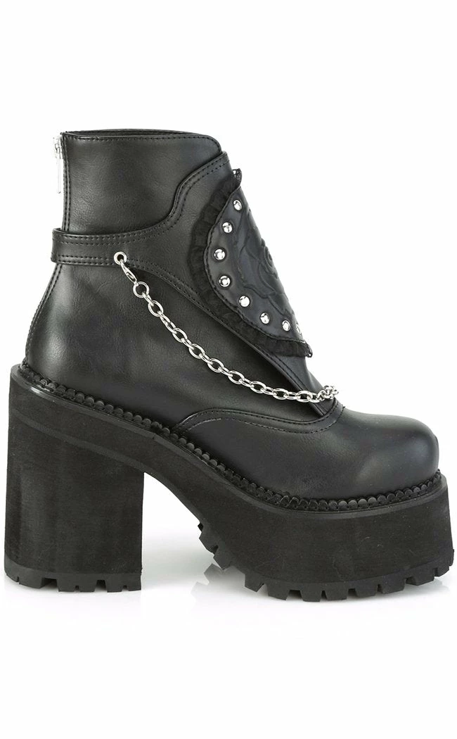 The ultimate biker boots!Β A rose embossed panel buckles in, studded and edged with lace.Β A removable chain with rose charms drapes over the boot, the perfect kicks for any rosy punk!