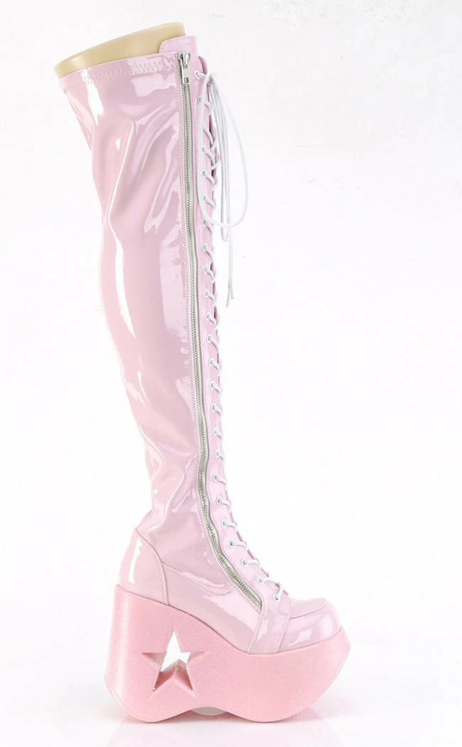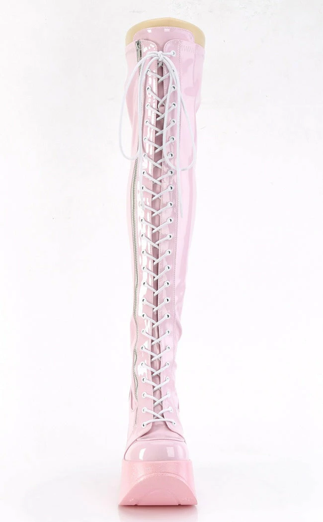 Baby, you’re a star!Β Β The DYNAMITE-318 boots are wicked thigh-highs made with stretch faux leather that tops a glittering wedge, securing with a full zip & lace-ups.