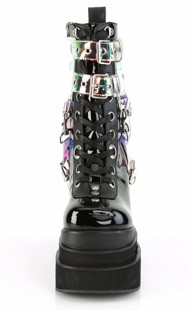 Shiny blackΒ chunky boot with an iridescent holo harness and bondage straps.