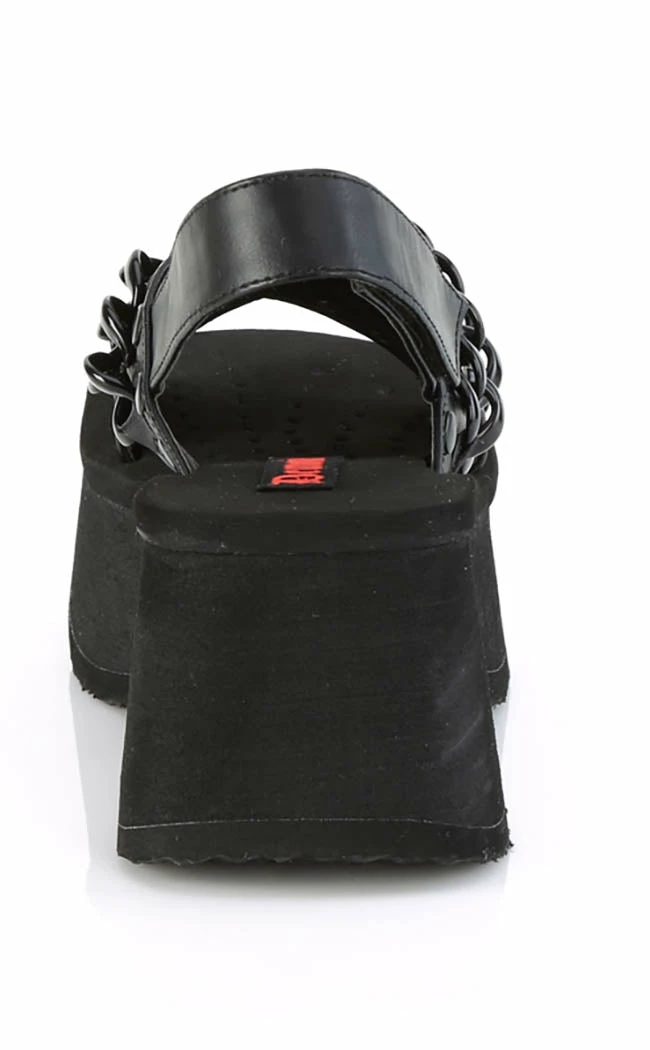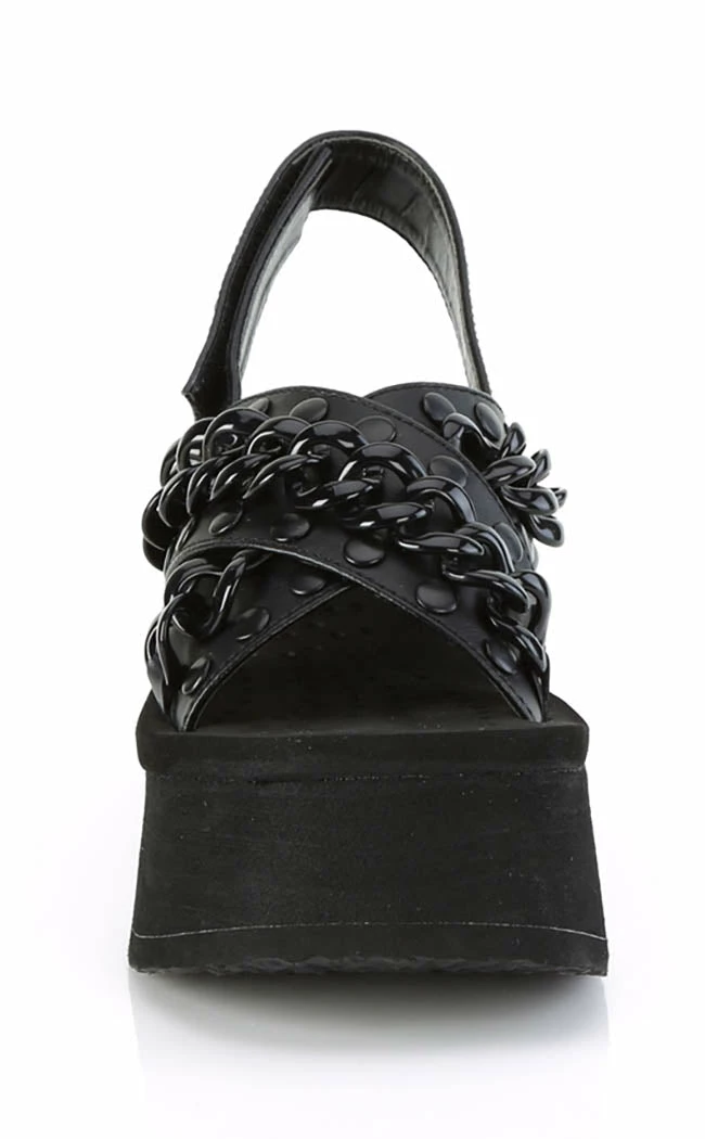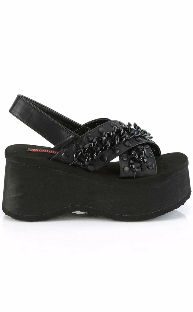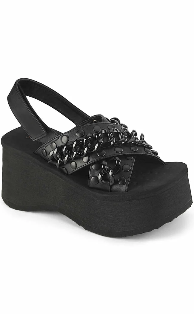 StayΒ Spookyβ’Β this summer with the FUNN-12 sandals!Β Add a little punk attitude to yer beach wardrobe with these wedge slingbacks, decked out in studs n chainz and securing with velcro.