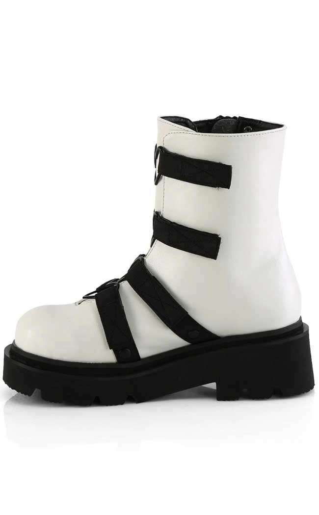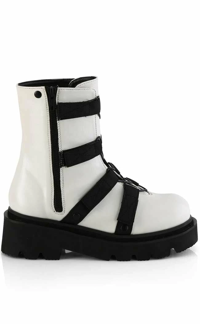 For the rebels and the renegades, theΒ RENEGADE-55 boots are where it’s at!Β Β These ankle boots secure with a side zip and feature heart ringsΒ secured by nylon straps for the badasses with a heart of gold.