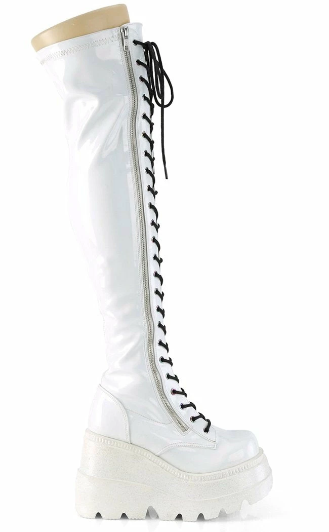 All the way up, baby!Β These tiered platform wedge boots are a cute variation on Demonia’s other chunky wedge collections. This boot goes thigh high and has a black metal side zip for easy access π