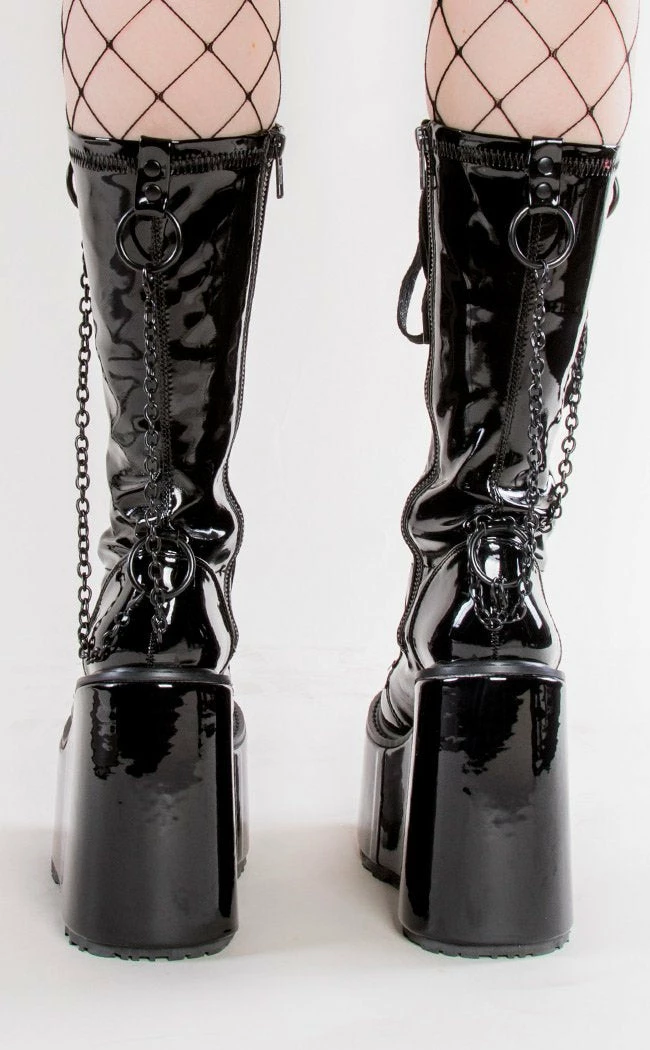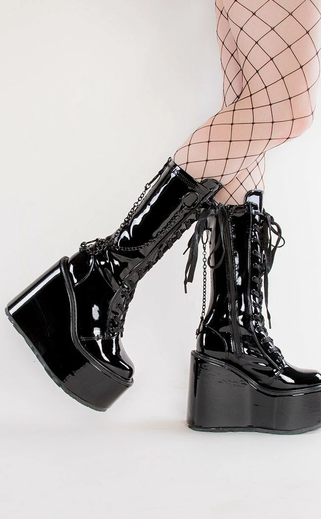 Come out swinging with the Swing 150 boots!Β Shining sleek in patent stretch PU, these babies feature the iconic Swing platform wedge, lace ups and some extra punk chains.Β Perfect for cyber punks and thrashers alike!