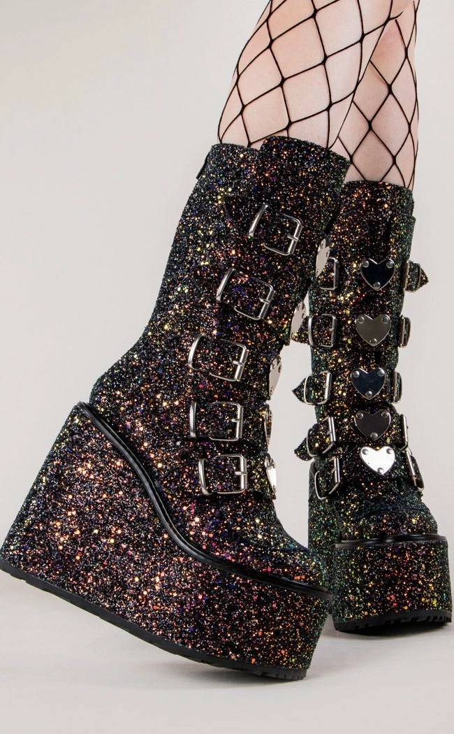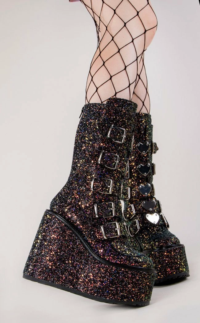Swing your way into the club with this series of platform wedged boots and shoes, with buckles and straps and decals galore!