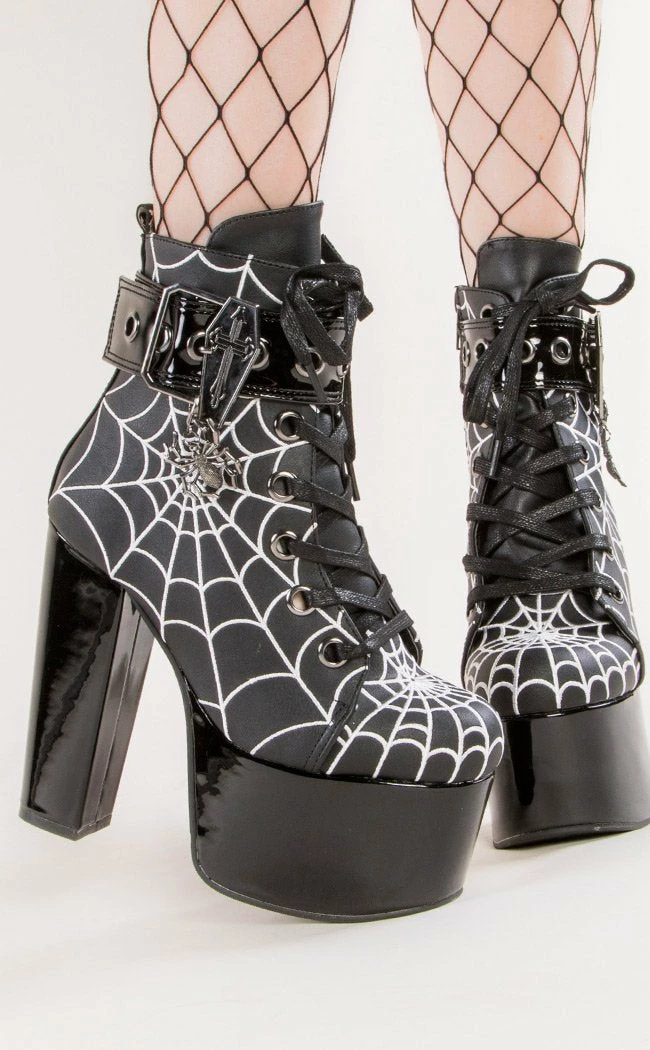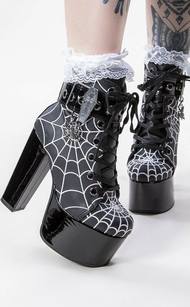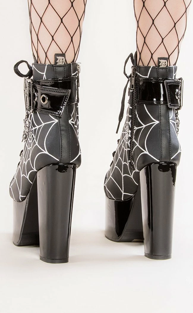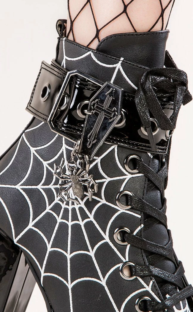The ultimate goth platform!Β The TORMENT-51 boots feature spiderweb embroidery on a matte black upper, contrasting with the patent black platform, heel and ankle strap.Β Crowning deets like the coffin buckle and spider charm are just *chef’s kiss*