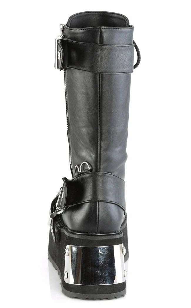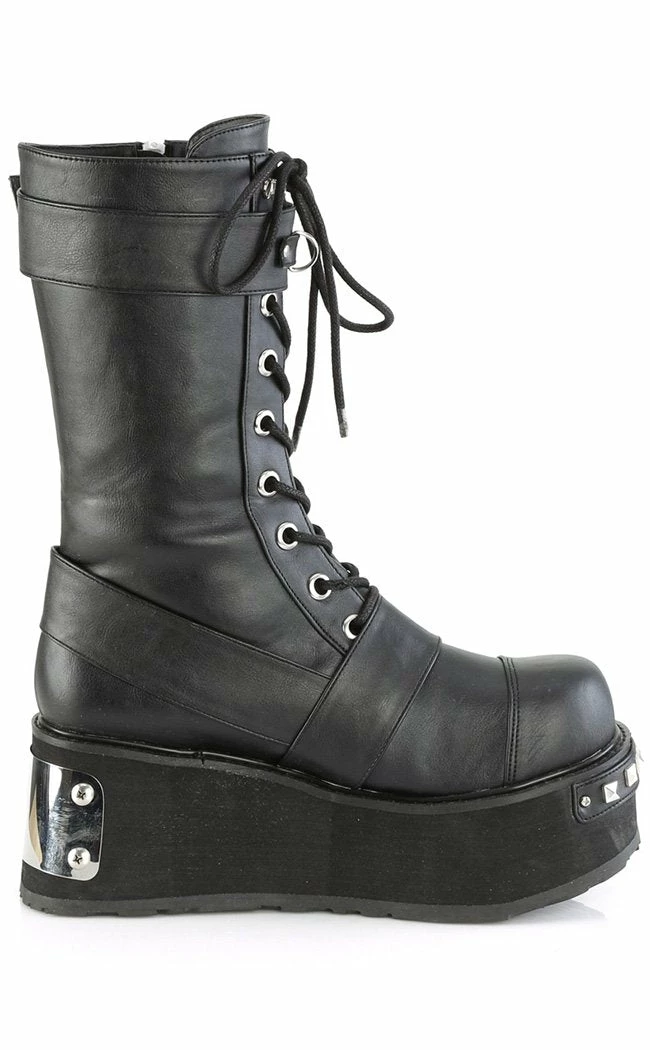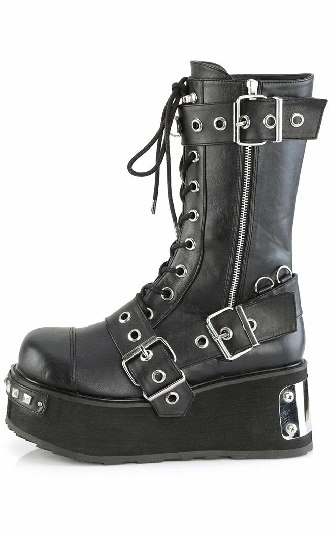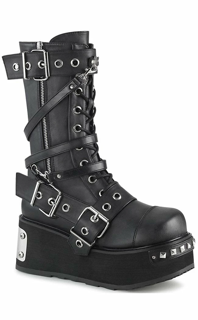 Trashy shoes for trashy peeps.Β The TRASHVILLLE-250 boots are a metal marvel, covered in straps of different thicknesses for a layered effect, the thinner strap being detachable.Β With a metal panel decal and studs, these boots are perfect for punky ‘fits and mosh ready.
