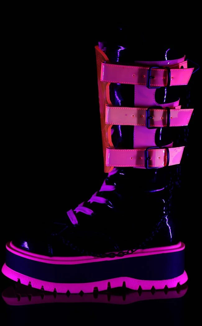 Glossy black patent, UV pink laces, panels and buckles bring the rave and the pitch black chains bring the punk.Β Kick against the pricks in hyper rave comfort!